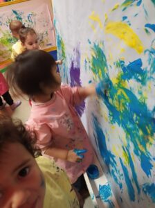 DECOUVERTE de la MATIERE et de la TEXTURE …… Certains hésitent et font leurs premiers essais du bout du doigt, d’autres se lancent franchement et y plongent les 2 mains !