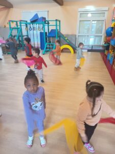- Danse : en utilisant des objets, nous avons commencer avec les foulards…on les fait tourner, on les pose par terre, on fait les fantĂŽmes, on s’en sert de jupe…