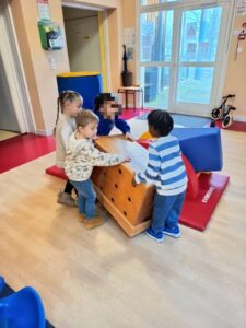 - Jeu des dĂ©mĂ©nageurs : transporter des Ă©lĂ©ments…mais ça se complique avec des tris selon la couleur/les objets, des objets imposants (apprendre Ă coopĂ©rer Ă plusieurs).