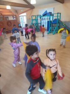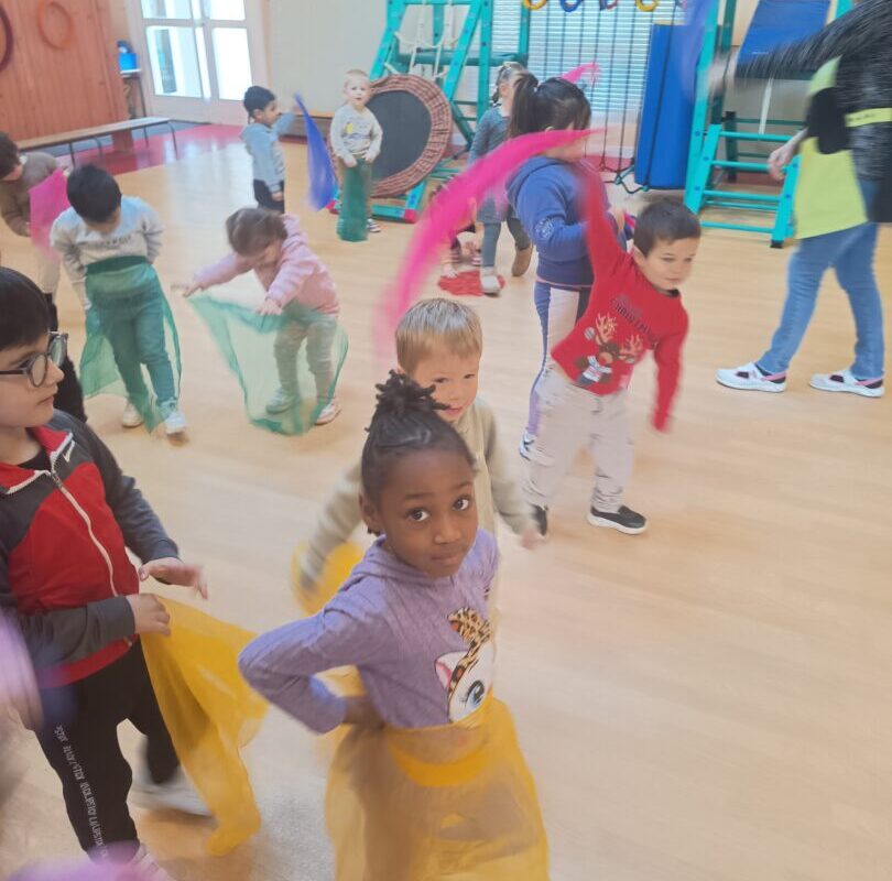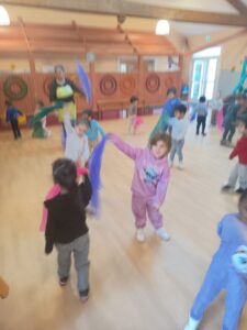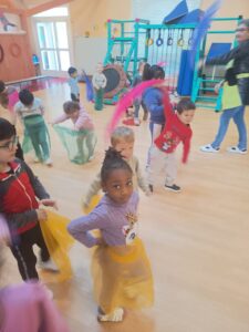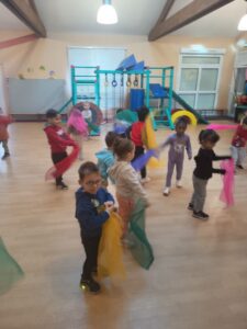 - Danse : en utilisant des objets, nous avons commencer avec les foulards…on les fait tourner, on les pose par terre, on fait les fantĂŽmes, on s’en sert de jupe…