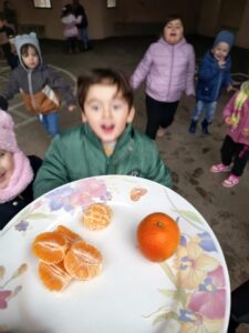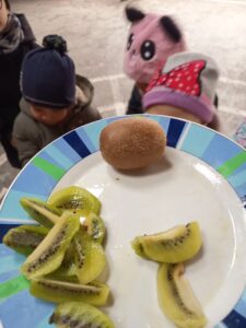 Les élèves ont ainsi pu déguster des pommes, des mandarines et des kiwis…mais avant ce moment on prend le temps d’observer le fruit en entier : Est-ce qu’on peut l manger en entier, faut-il l’éplucher de quel couleur est-il (extérieur/intérieur)? Y a-t-il des pépins/un noyau/des grains?