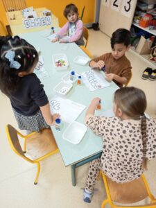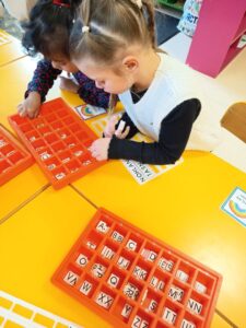- Découvrir son initiale et les lettres d’ELMER (PS)/travail sur l’écriture de mot avec les lettres mobiles (MS)