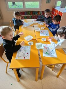 - Réalisations d’œuvres collectives en arts visuels : à plat (peinture au doigt) et en 3D (réalisation d’un structure en papier mâché sur ballon et rouleau de carton/peinture)