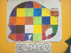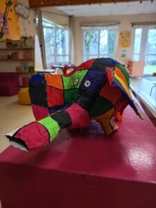 L’album qui nous a servi pour travailler cette période avait pour personnage principal ELMER, un éléphant particulier puisqu’il n’est pas gris mais bariolé!