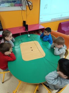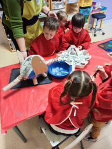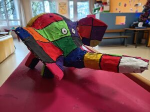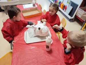 - Réalisations d’œuvres collectives en arts visuels : à plat (peinture au doigt) et en 3D (réalisation d’un structure en papier mâché sur ballon et rouleau de carton/peinture)