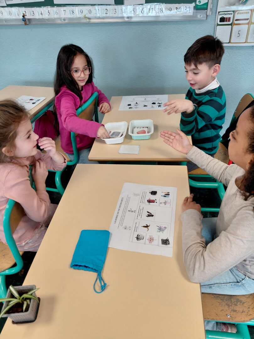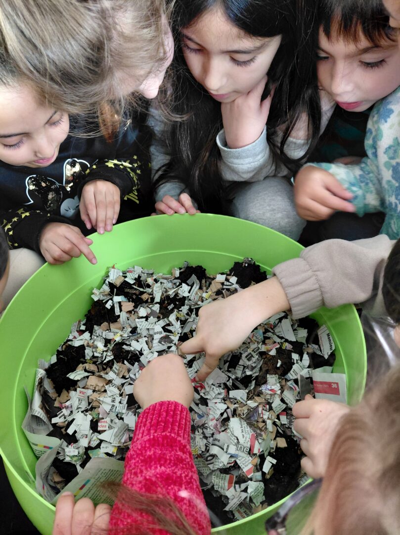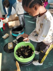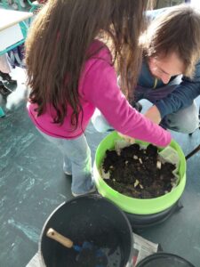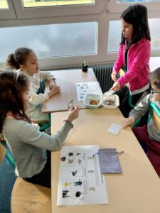 Pour sa deuxième intervention, Valentin de la maison de la nature est venu installer un lombricomposteur et nous apprendre à trier les déchets alimentaires que l’on peut mettre dedans pour que les lombrics les digèrent, ce qui produit un engrais. Les enfants sont chargés de prendre soin des lombrics et les nourrir avec des déchets de cuisine.