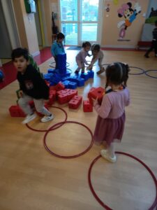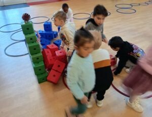 Quelle Ă©quipe sera la plus efficace pour amener tous les cadeaux au pied du sapin? (sachant qu’on ne doit prendre qu’un seul cadeau par trajet…et ce trajet doit se faire par le chemin construit pas les copains!)