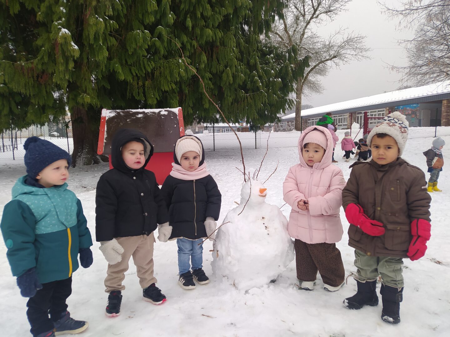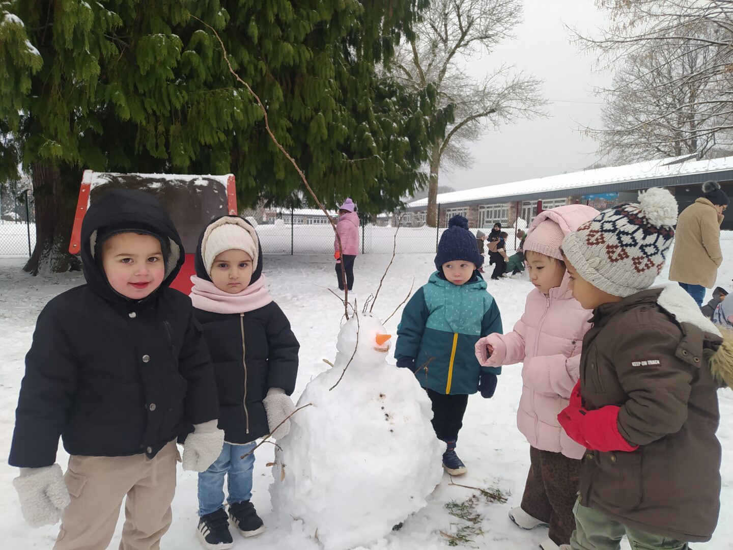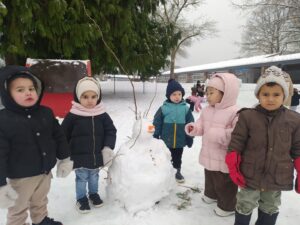 Il y a beaucoup de neige dans la cour de l’école ; les petits et les moyens ont fait un bonhomme de neige.