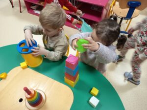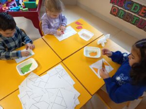 Pour les PS, on est toujours sur la reconnaissance des 3 formes de bases : carré, rond et triangle, à travers des jeux de touché, de la peinture…et de la manipulation avec les jeux d’encastrements ou d’empilement selon la forme et la taille.