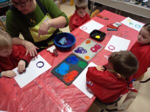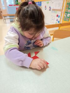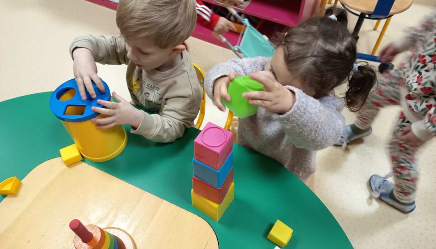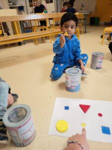 Pour les PS, on est toujours sur la reconnaissance des 3 formes de bases : carré, rond et triangle, à travers des jeux de touché, de la peinture…et de la manipulation avec les jeux d’encastrements ou d’empilement selon la forme et la taille.